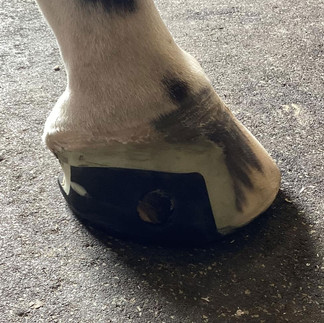 The first images are the day of resection. Second set of images is five weeks for a follow up shoeing. I chose the heart insert in the glue shoe with a pour on second application being we did get a substantial amount of growth in the first rotation. There would be no longer need for access through a hospital plate in this next rotation.