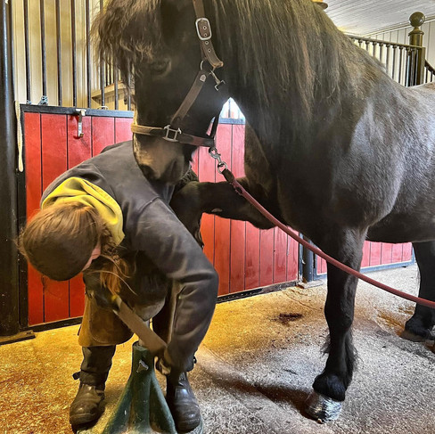 “This afternoon we took a drive to my apprentice stable, and I showed and taught her how to trim, prep and glue shoes on her retired Döle horse.